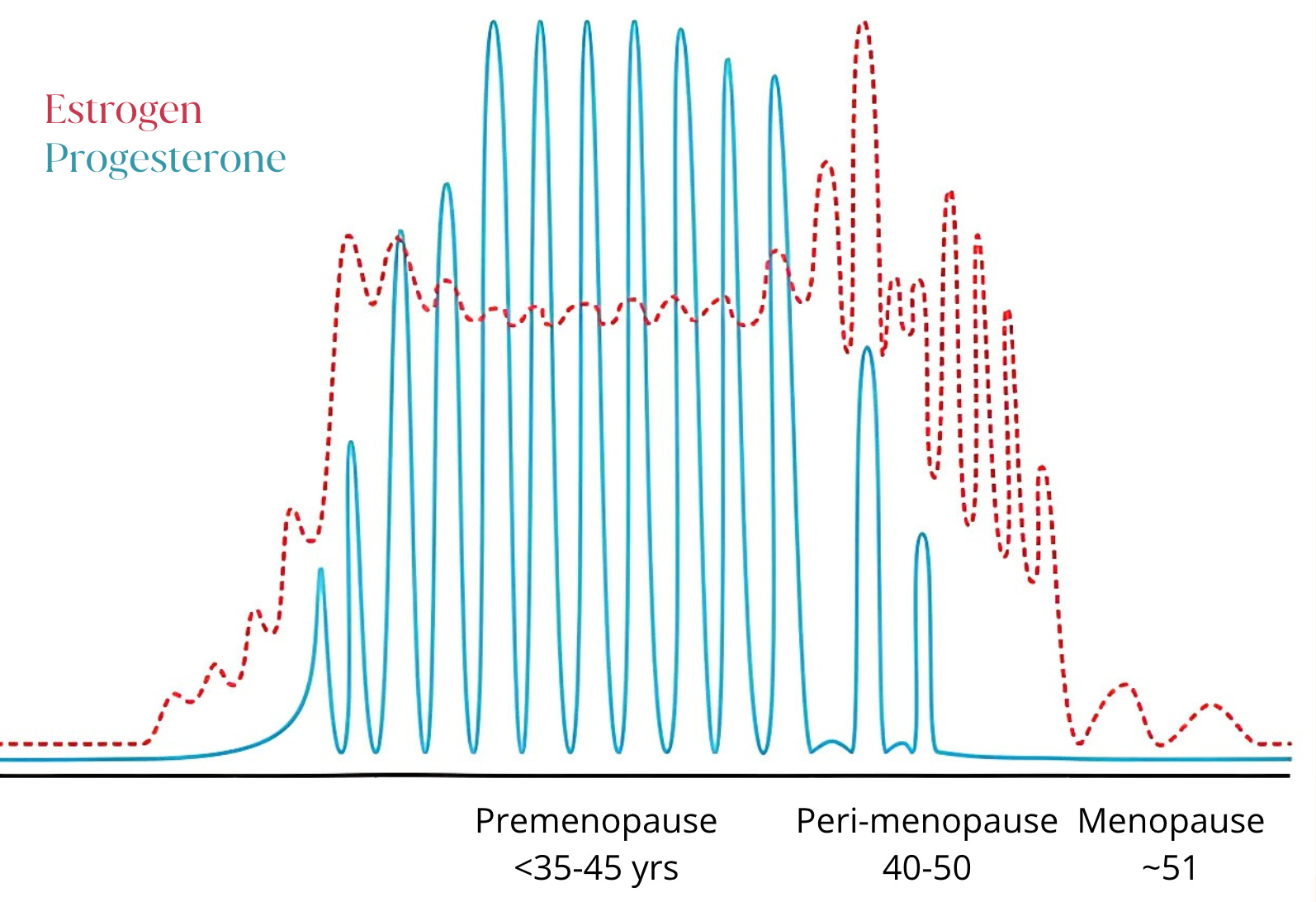 This graph tells the story of how our main reproductive hormones, estrogen and progesterone, fluctuate wildly during the perimenopause transition. At the beginning of perimenopause, estrogen levels can be high: your body is trying to rev up its ovulation in protest! And, in comparison, progesterone levels are decreasing.