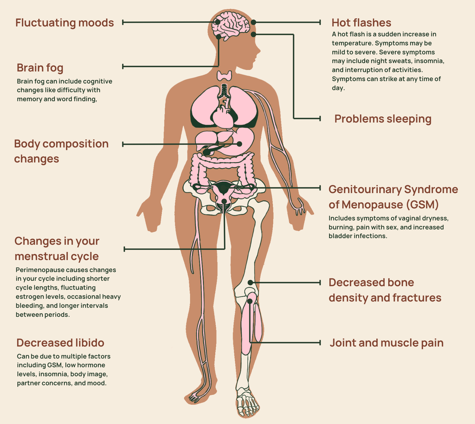 This body map marks some of the common menopause symptoms: