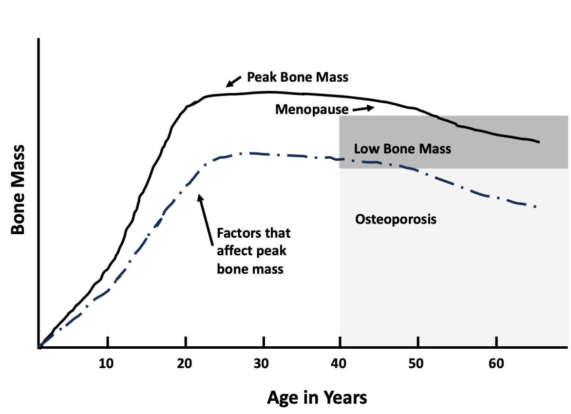 This image illustrates why it’s so essential to do our part to achieve peak bone mass sooner rather than later. Like a financial investment which compounds over time, prioritizing peak bone mass earlier will set us up for compounded bone “wealth” as we age.
